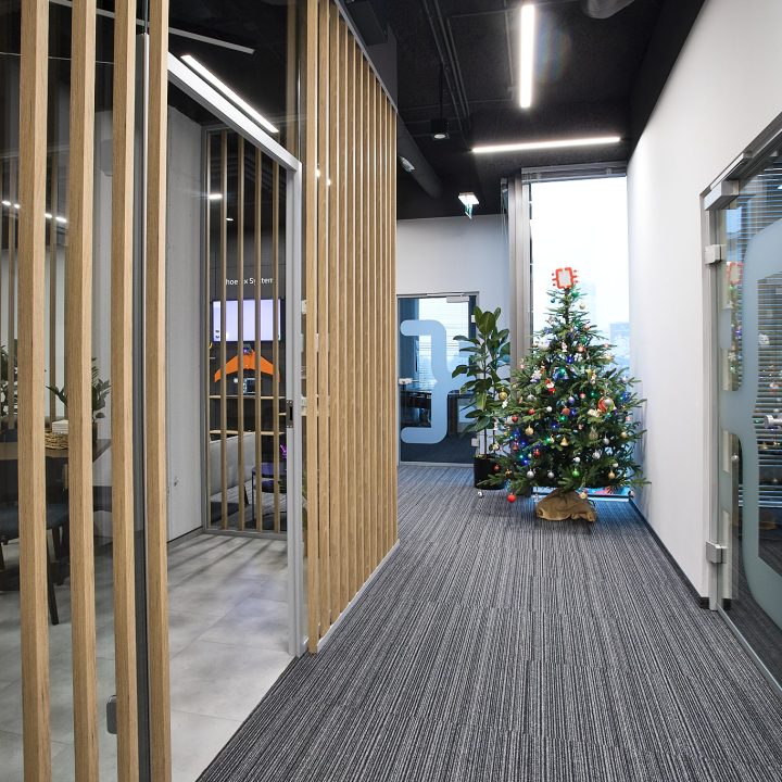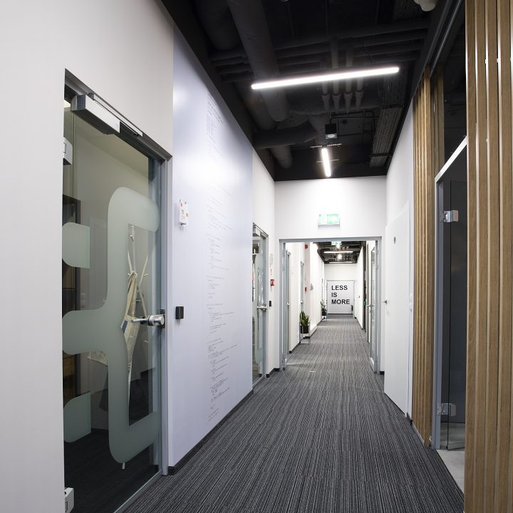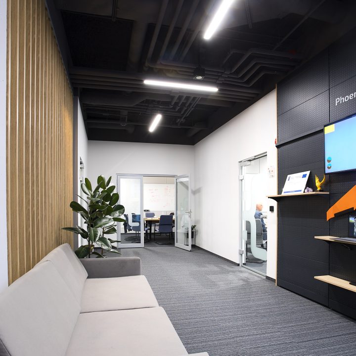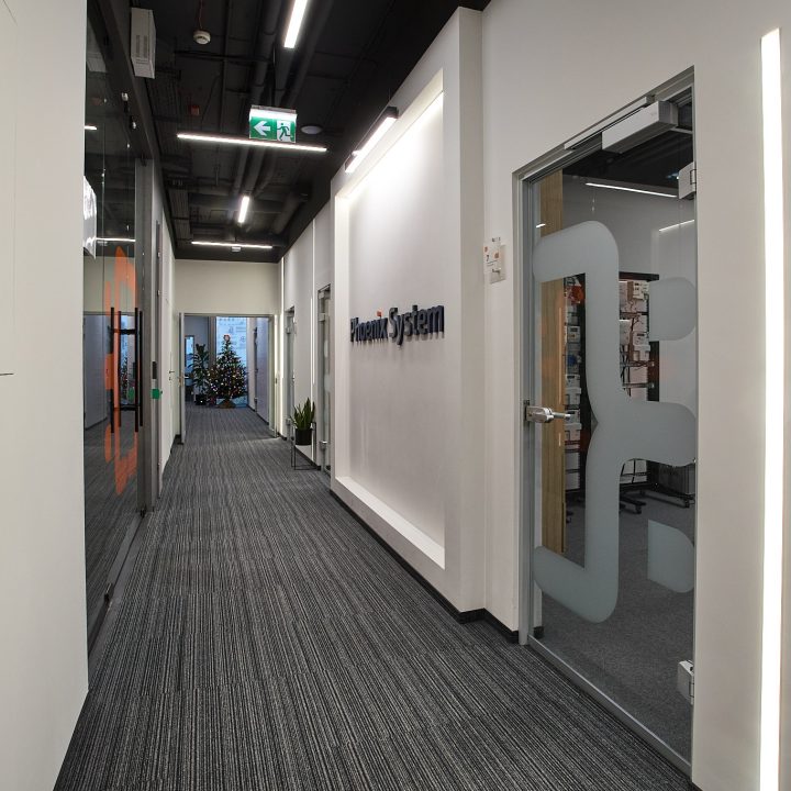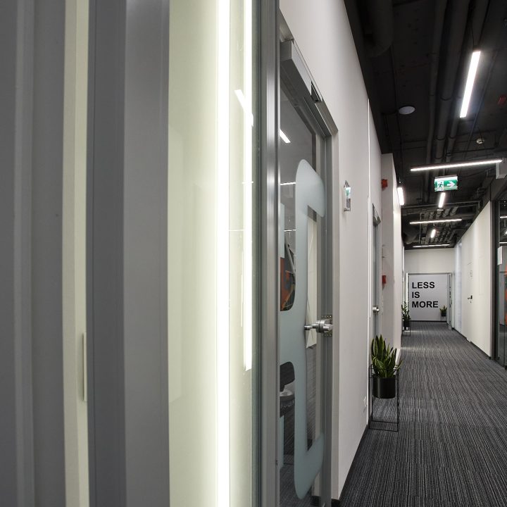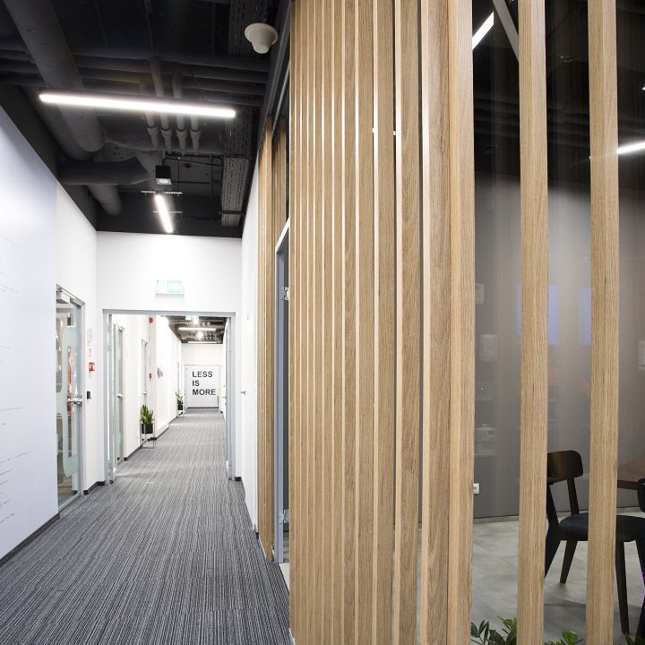 Wykorzystanie wewnętrznych zespołów Asemblo pozwoliło na pełną kontrolę nad każdym detalem wykończenia biura.