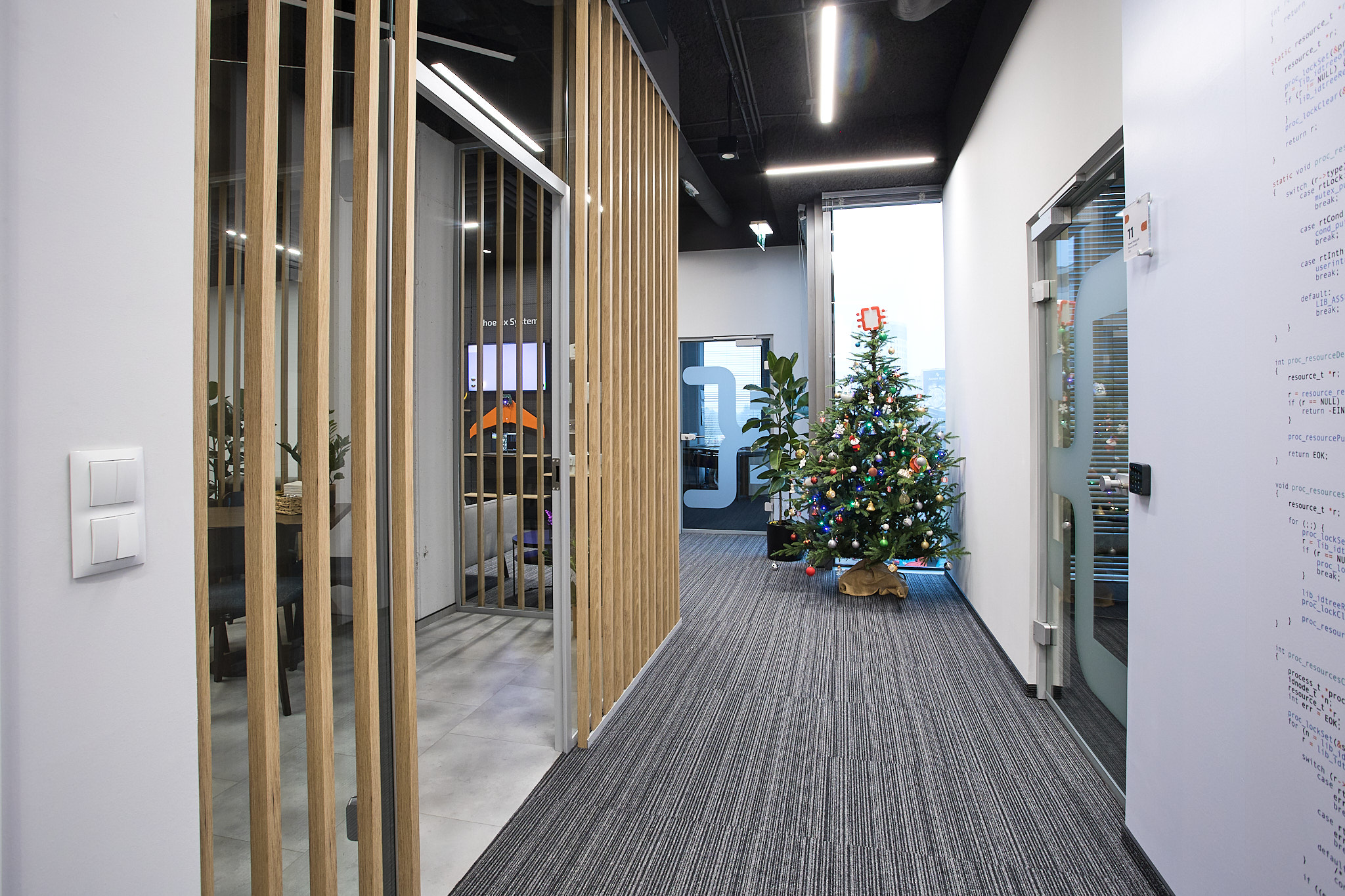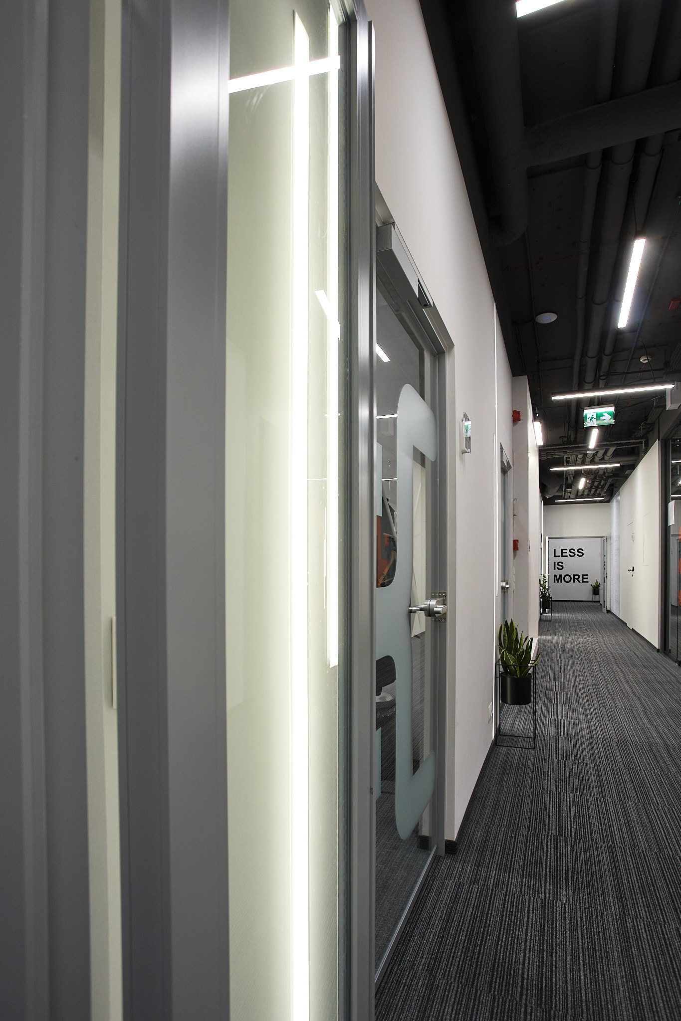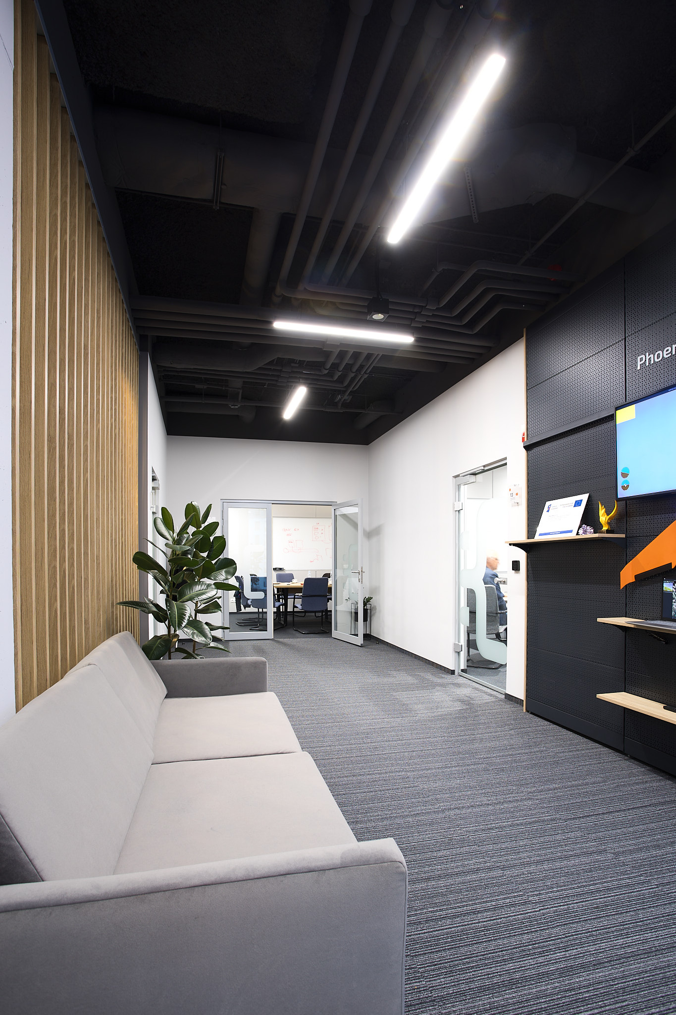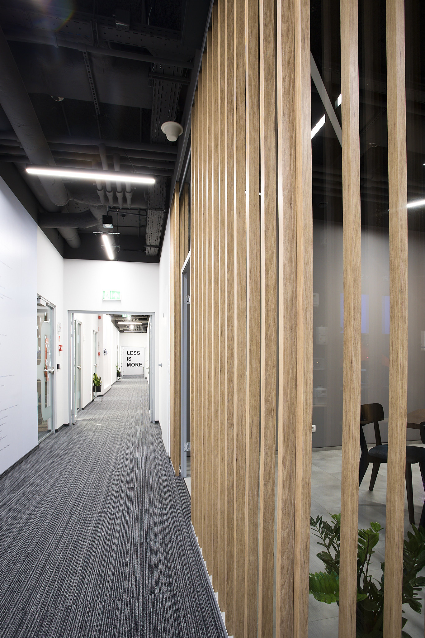 Wykorzystanie wewnętrznych zespołów Asemblo pozwoliło na pełną kontrolę nad każdym detalem wykończenia biura.